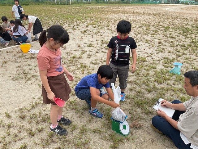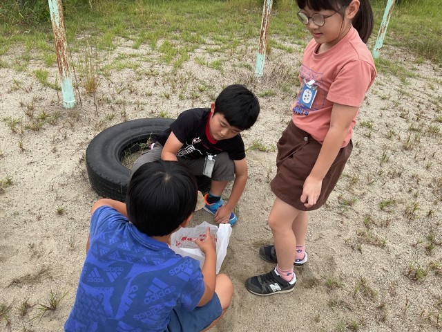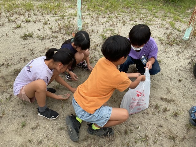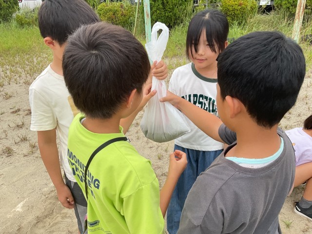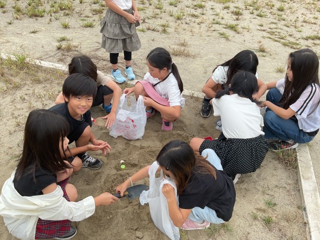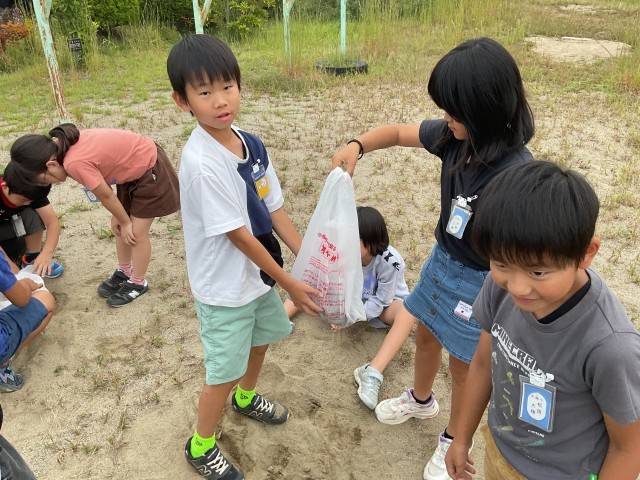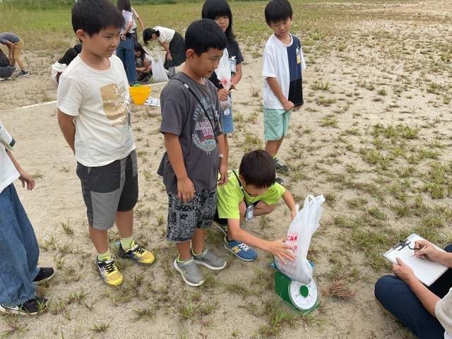 算数で「重さ」の学習が進んでいます。これまでに、グラム、キログラムなどといった重さの単位やはかりの読み方などを学習しました。今回は、1kgの感覚を覚えるために、袋に砂を1kg入れます。「もうちょっといるんじゃない?」「教室のタブレットはもう少し重かったよ。」「なんか重たすぎる気がするなぁ。」などと話し合いながら、グループで1kgぴったりを目指してがんばっていました。