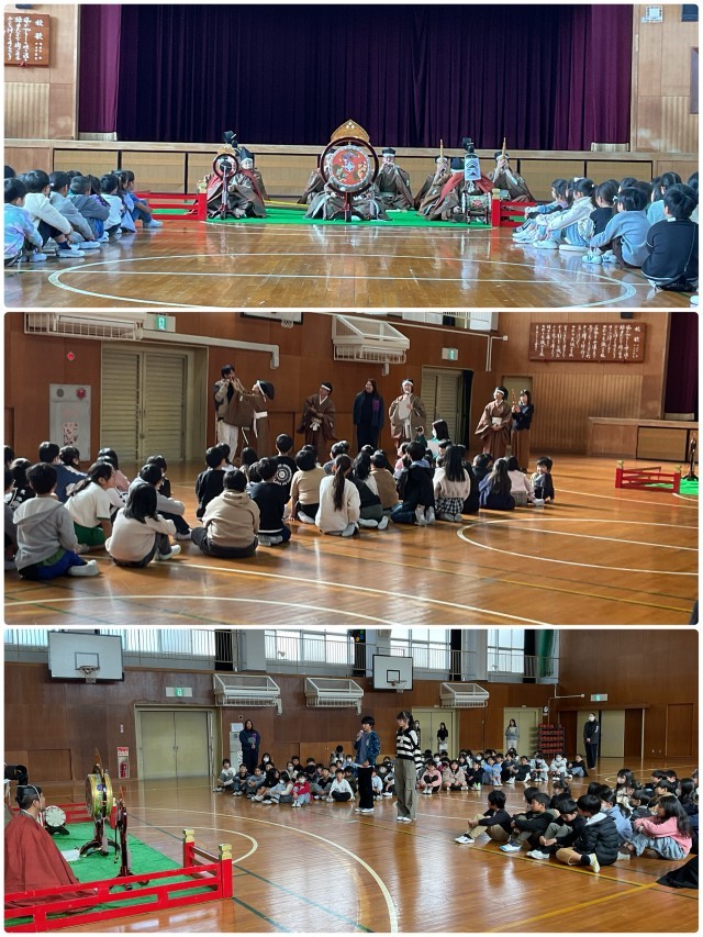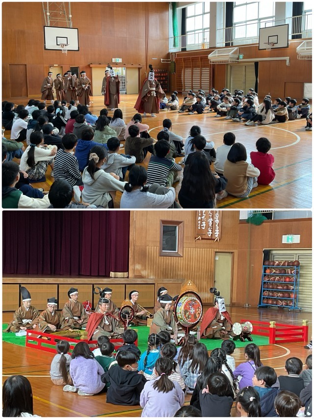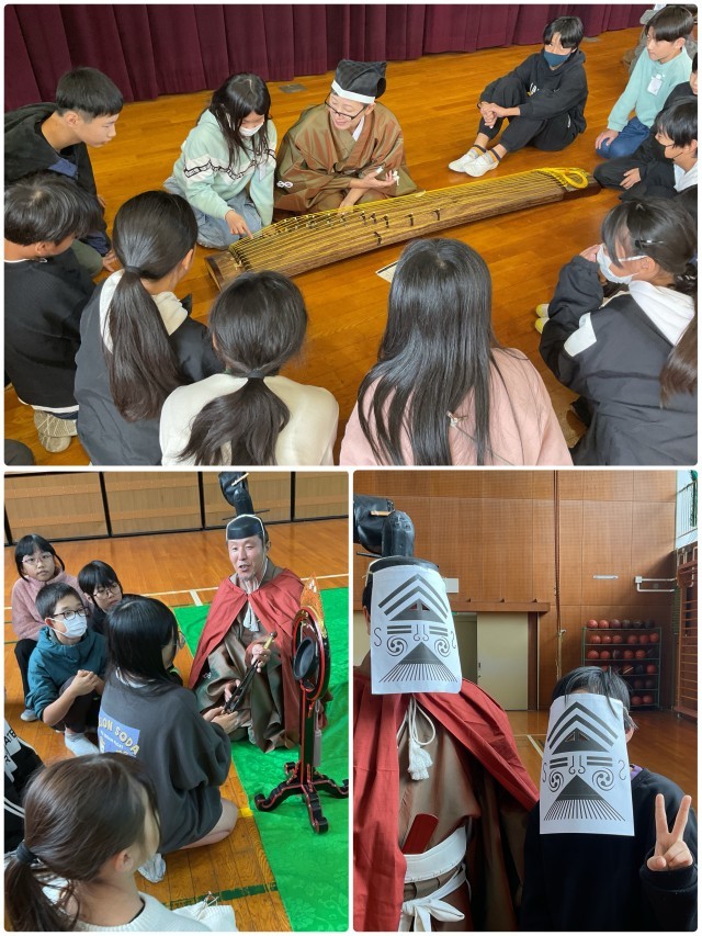 笙(しょう)や篳篥(ひちりき)、龍笛(りゅうてき)などの楽器の音色に包まれると、体育館が厳かで美しい空間に変わりました。子どもたちは、普段なかなか耳にすることのない音に興味津々で、静かに聴き入っていました。