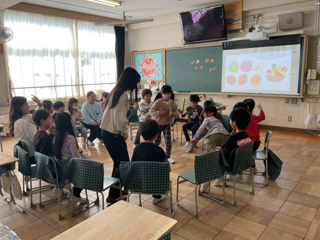 果物の英語表現を、発音練習やレクリエーション(神経衰弱・フルーツバスケット)を通して、学ぶことができました。
