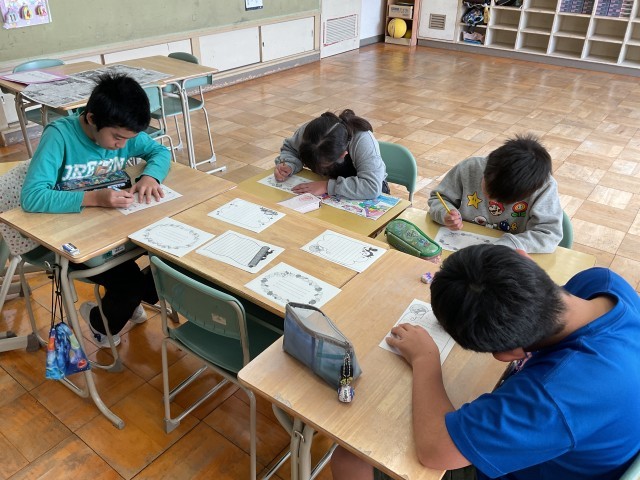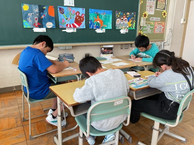 2年生と6年生で読書感想画の鑑賞会を行いました。
