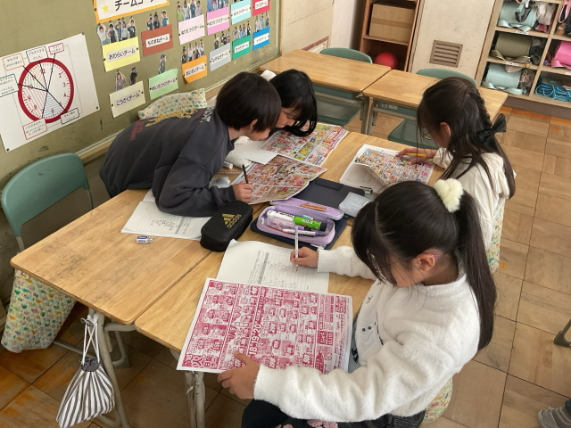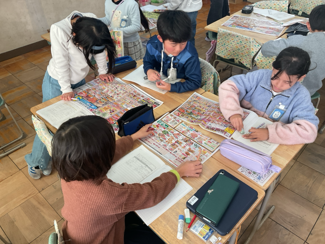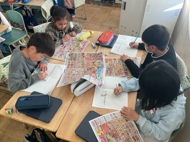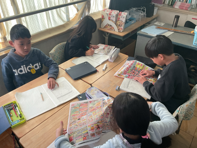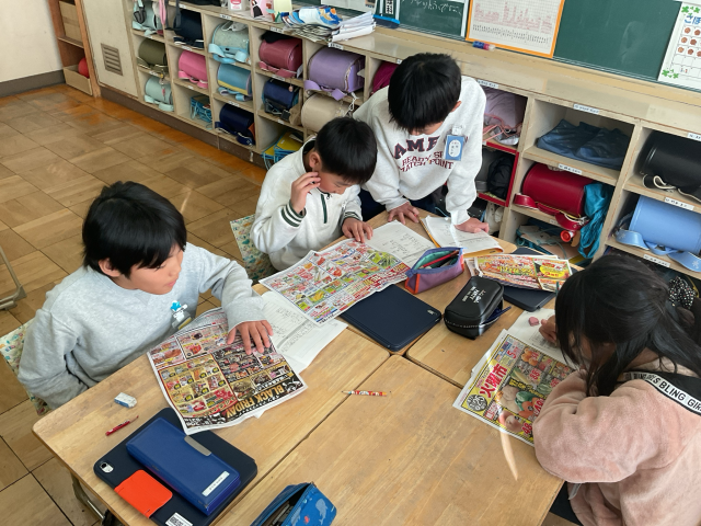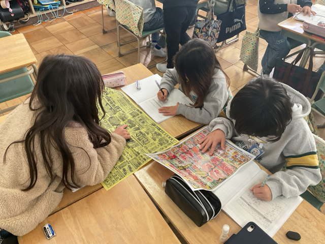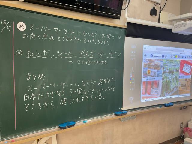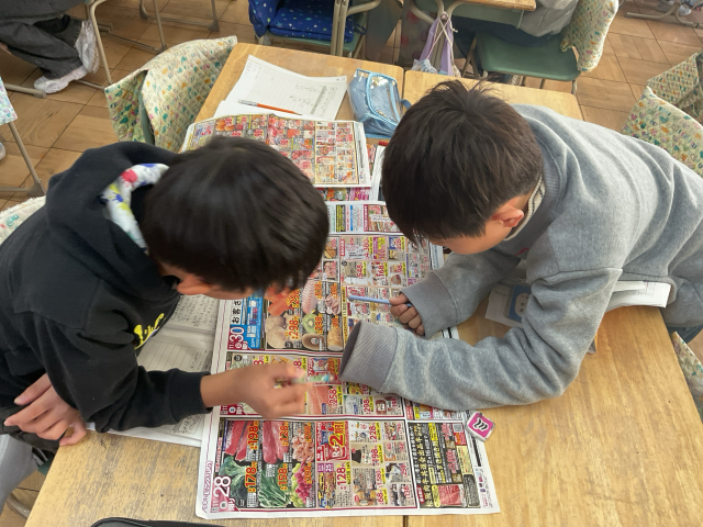 スーパーマーケットの学習で、お店に並んでいる野菜、果物、肉、魚などがどこからやって来るのかを調べました。値札、段ボール、シール、チラシなど、産地を調べる方法を学習した後、今回はチラシを使って、品物がどこから来るのかを調べました。調べていく中で、国内だけでなく海外からも多くの品物が運ばれていることに気付きました。