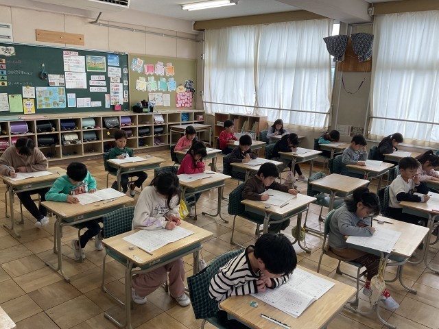 今回は国語と算数の2教科に取り組みました。これまでの学習成果が問われる場として、指導にあたる教職員も緊張感を持って見守りましたが、子どもたちは最後まで高い集中力を維持し、真剣な面持ちで問題に向き合っていました。