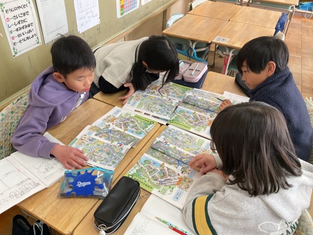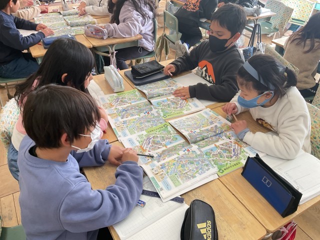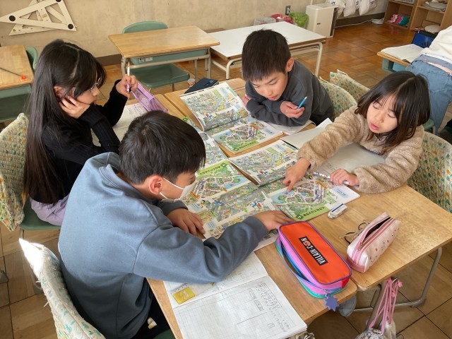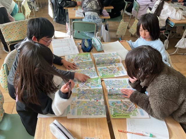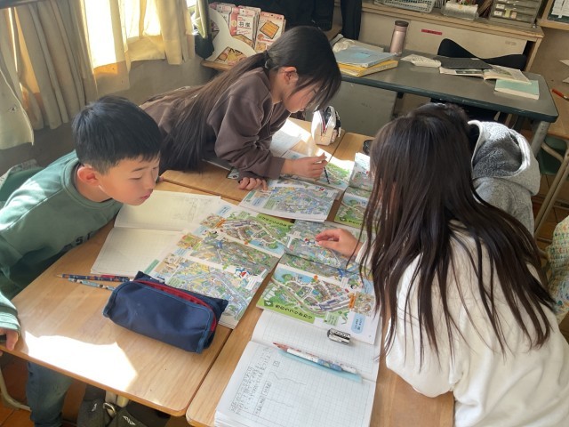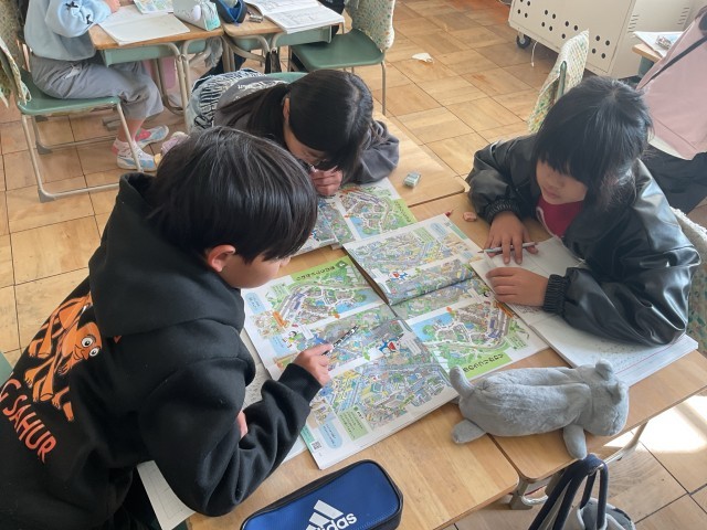 3年生の社会科では、「市のうつりかわり」について学習しています。イラストを見ながら、100年前・50年前・現在の町の様子を比べ、建物や交通の変化や、田んぼが減り住宅が増えていることなどについて話し合いました。今後は、小牧市の昔と今の違いについて調べ、地域の変化への理解を深めていきます。
