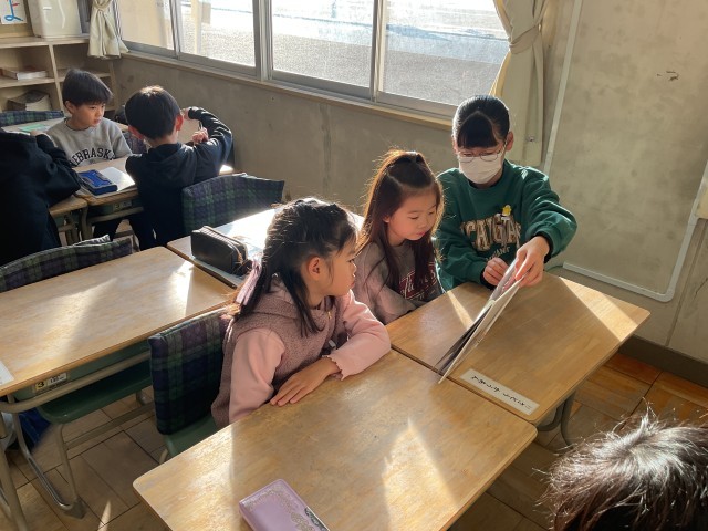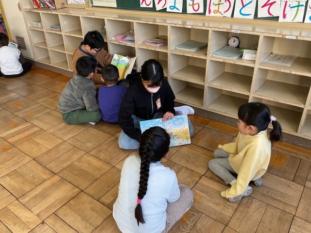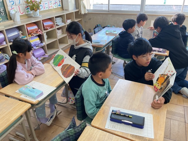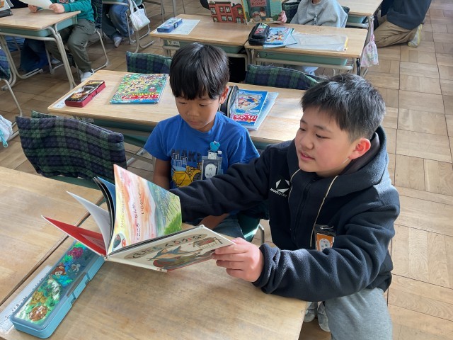 6年生が本を選び、ペアになって読み聞かせをしました。読み終わった後も、「どんな場面がすきだった?」「もういちど読みたいページある?」と積極的に1年生と関わろうとする様子が見られました。