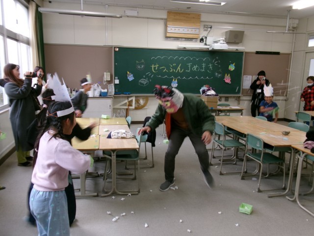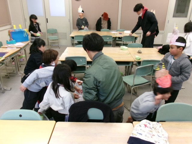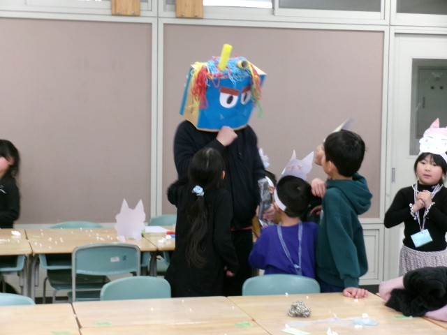 みんなで鬼のお面やキッチンペーパーで豆を作りました。