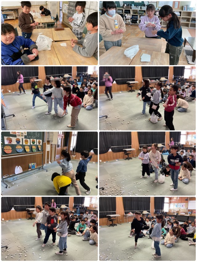 その後は、いよいよ豆まき体験です。今回使った「豆」は本物ではなく、子どもたちが一粒ずつ紙を丸めて作った手作りの豆です。準備から自分たちの手ですべて行うことができました。