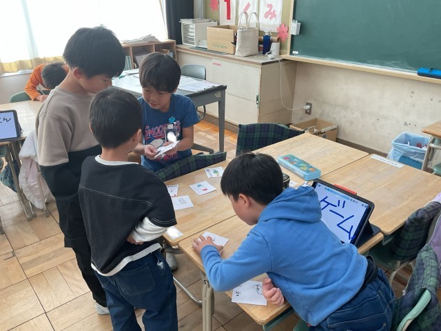 国語で、「くだもの」といった【上位語】と、「りんご」「ぶどう」「みかん」といった【下位語】があることを学習しました。その上で、グループに分かれてお店屋さんごっこをしました。