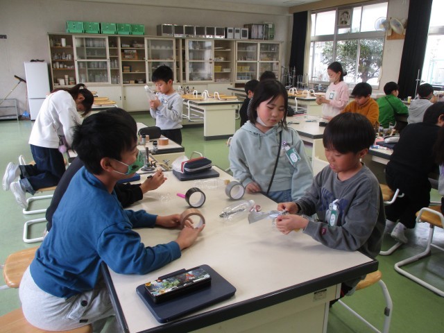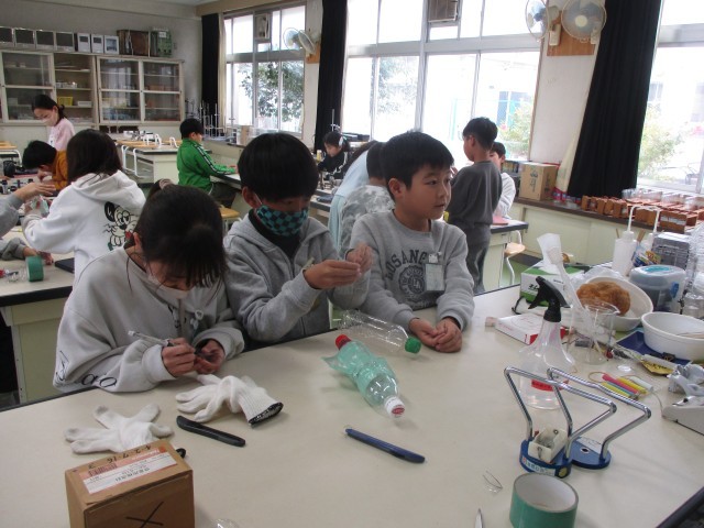 2月26日(木) 4年生の理科では、水と空気の性質を利用したペットボトル・ロケットを作っています。