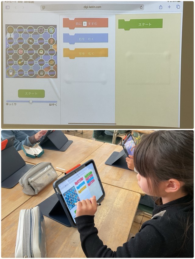 ICTの先生をお招きして、「プログラミング」の授業を行いました。ロケットを目的地まで動かすプログラムのをつくる活動を通して、プログラミングの考え方を体験することができました。