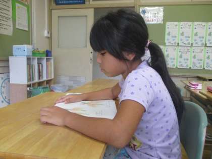 今日9月7日は、2年生の読書の時間。2学期になり初めてです。1学期は先生に読んでもらっていた子どもが「自分で読みたい。」と言いました。ゆっくりですが、頑張って読んでいました。