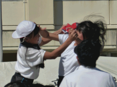 紅白対抗の成績は、9対11で赤組がリードしてます。午後の部は4年生の活躍もあり、白組が追い上げてきました。残すは、5・6年生の騎馬戦と大玉送りです。この勝負をどちらが取るかによって、紅白対抗の結果を大きく左右します。