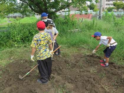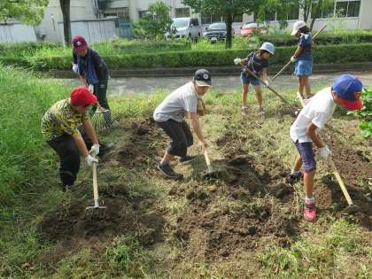 安全に気をつけながら、鍬を使って一生懸命に畑を耕しました。校長先生も一緒に作業に参加してくださり、子ども達も嬉しそうでした。