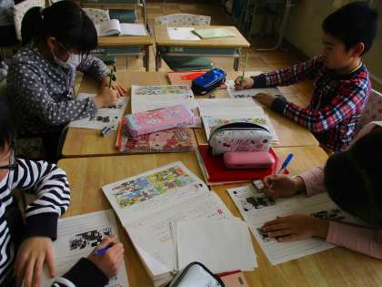 国語で修飾語を使った文作りをしました。教科書のさし絵にある言葉を使って、だれがどんなことをしたかをくわしく書きました。修飾語を増やしていくうちに、あらあら?主語と述語の関係がおかしくなる時もありましたが、できた文をグループで読み合って、直しました。