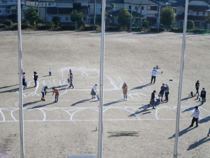 運動場に目印の線を描いて、手本を参考にして描くこと1時間…立派な大仏を完成させました!