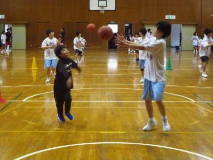 ドリブル練習・ツー面パス練習・天井パスです。チェストパスで天井に向けてパスをして何回拍手ができるかを競いました。(畑中典夫)
