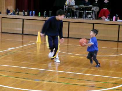 動いてパスをする。ゴール下でボールの取り合いをする。みんな笑顔で取り組むことができました。(畑中典夫)