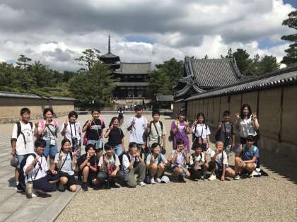 法隆寺に10分遅れで到着しました。日差しが強いです。
