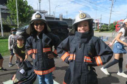 防火衣を着せてもらいました。最後には消防士さんたちが防火衣を着装しているところを見せてもらいました。授業で約30秒で着替えられると知っていても驚きでした。