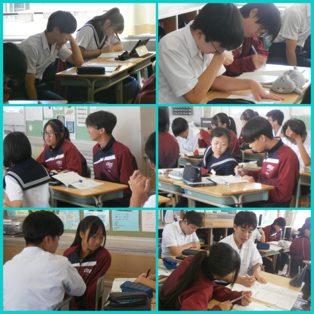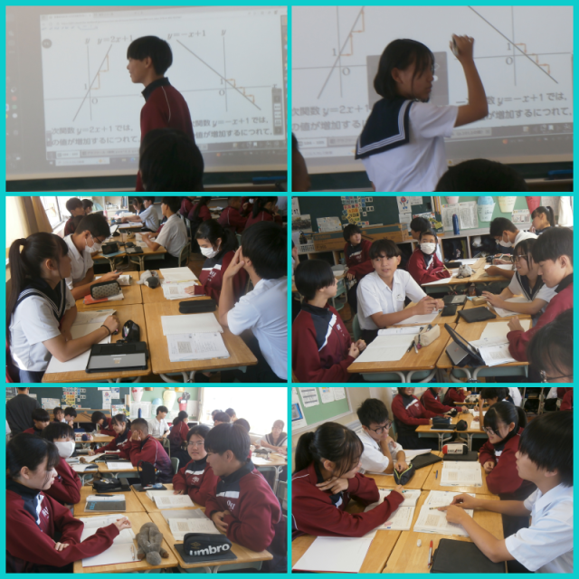 関数の変化の割合について学習を行っています。今日は、変域の効率的な求め方をグループで考えました。