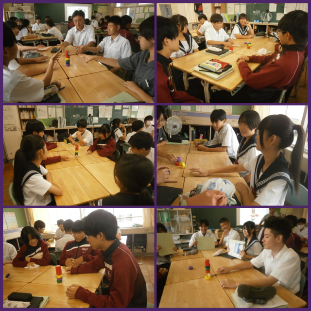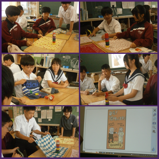 力のはたらきについて学習を行っています。だるま落としやテーブルクロス引きを行い、慣性の法則について考えました。