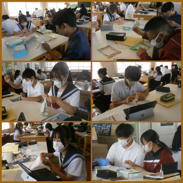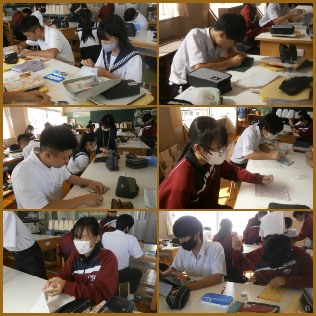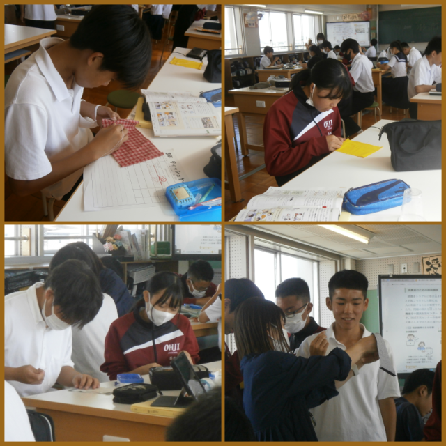 消費者トラブルについて学習を行っていました。もしかしたら巻き込まれることがあることを心に留めておきたいですね。その後、ティッシュケース作りを行っていました。動画や教科書、先生に確認しながら、まつり縫いを丁寧に進めていました。