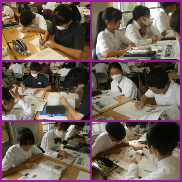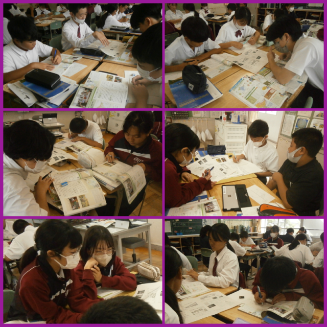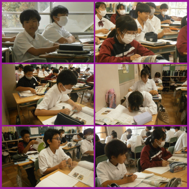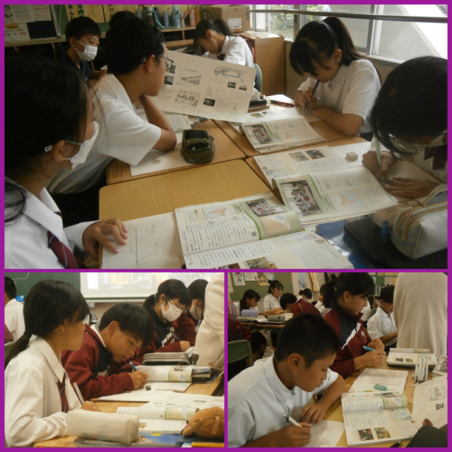 地理の学習を行っています。インドが急速に発展したのはどうしてなのかを話し合いました。教科書はもちろん、資料も使い、グループで考えをまとめていました。