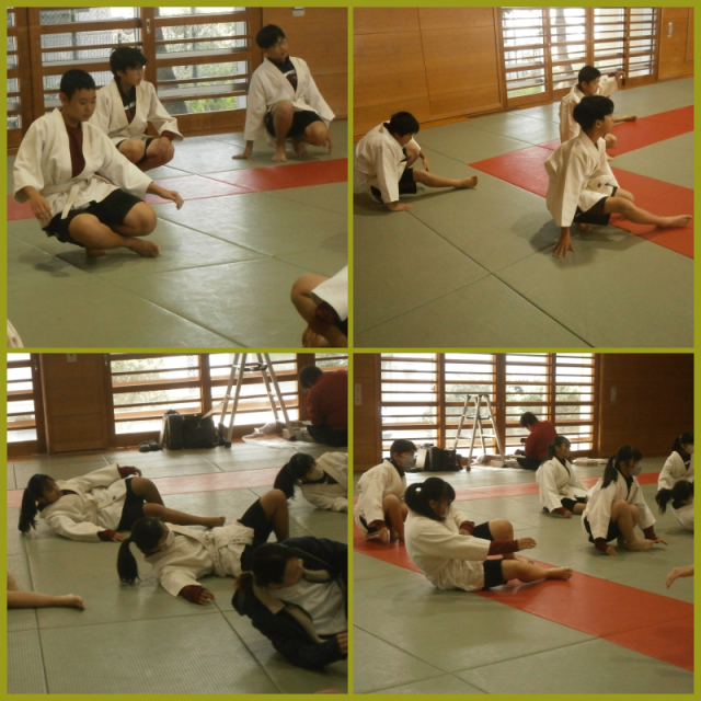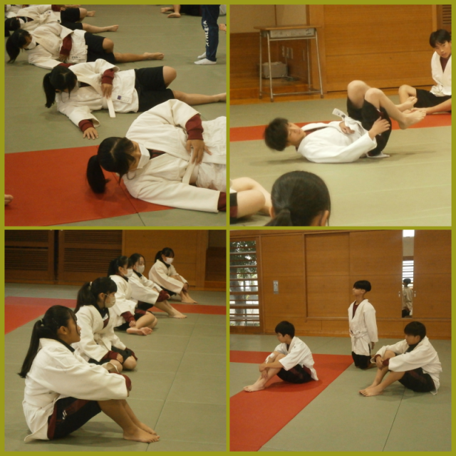 柔道に取り組んでいます。けがをしないためにも、しっかりと受け身の練習を行っていました。