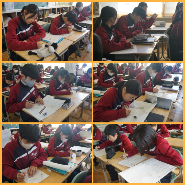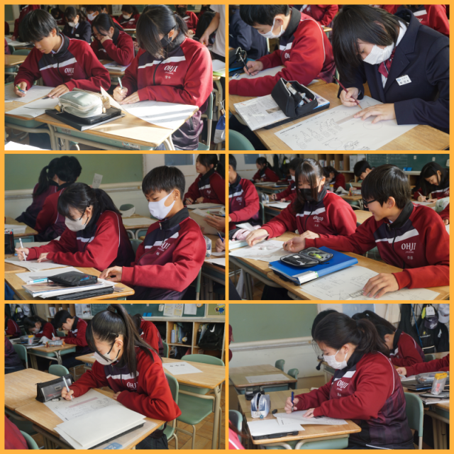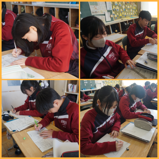 立体感のある平面構成の作図に取り組んでいます。課題が徐々に難しくなってきましたが、解説を読んだりしながら、進めていました。