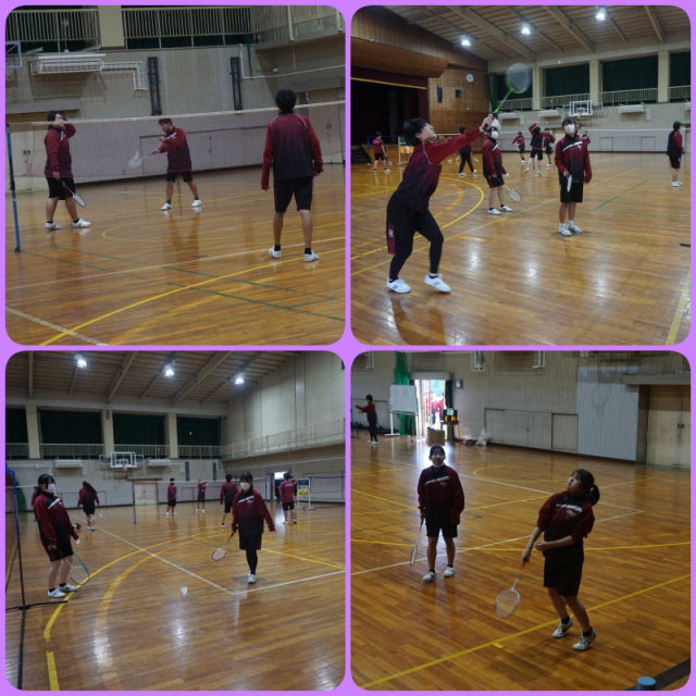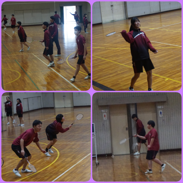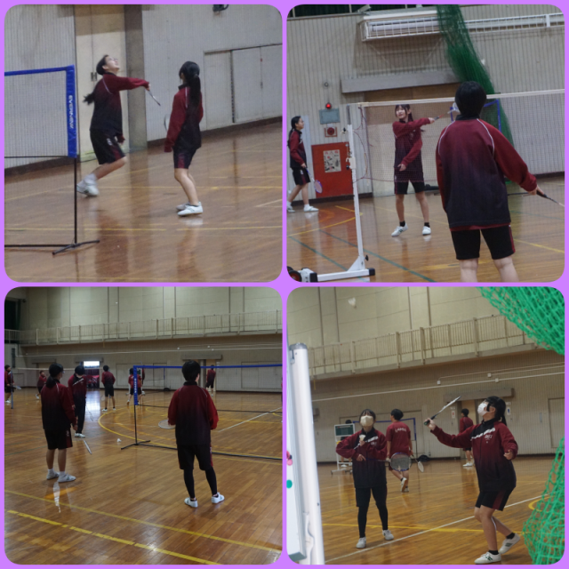 バドミントンに取り組んでいます。チームやルールなど、自分たちで決めていました。練習では、和気あいあい楽しみつつ、いざ勝負になると真剣になりそうです。