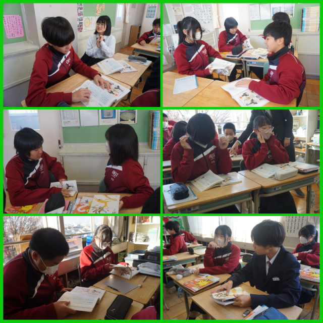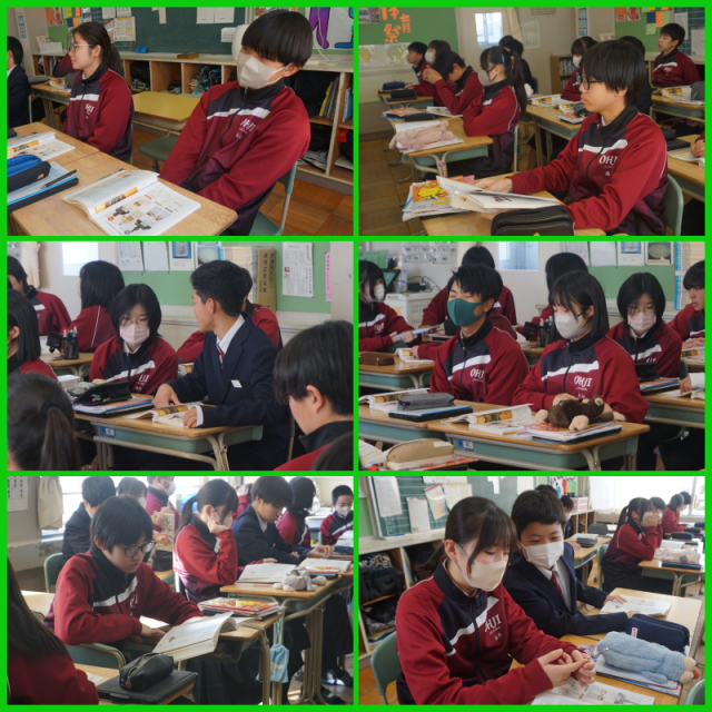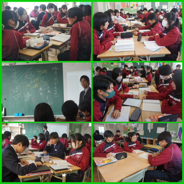 平家物語の学習を行っています。冒頭部分の暗唱を行い、「扇の的」の内容を深めました。自分の考えを出し合い、活発に意見交換を行っていました。