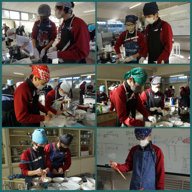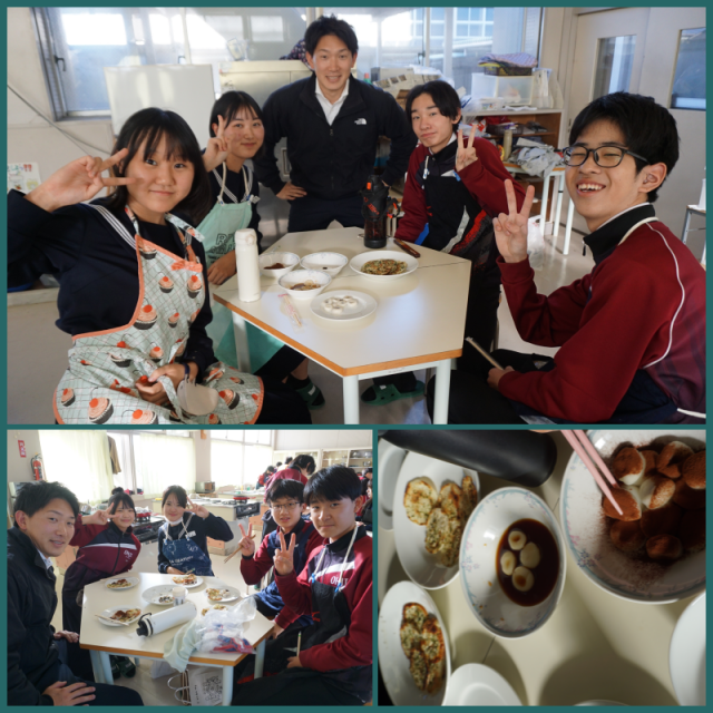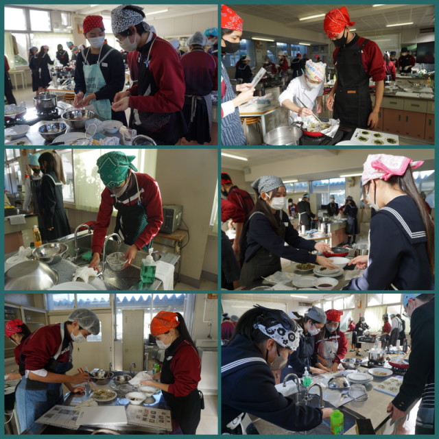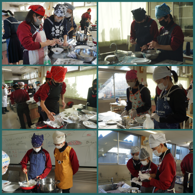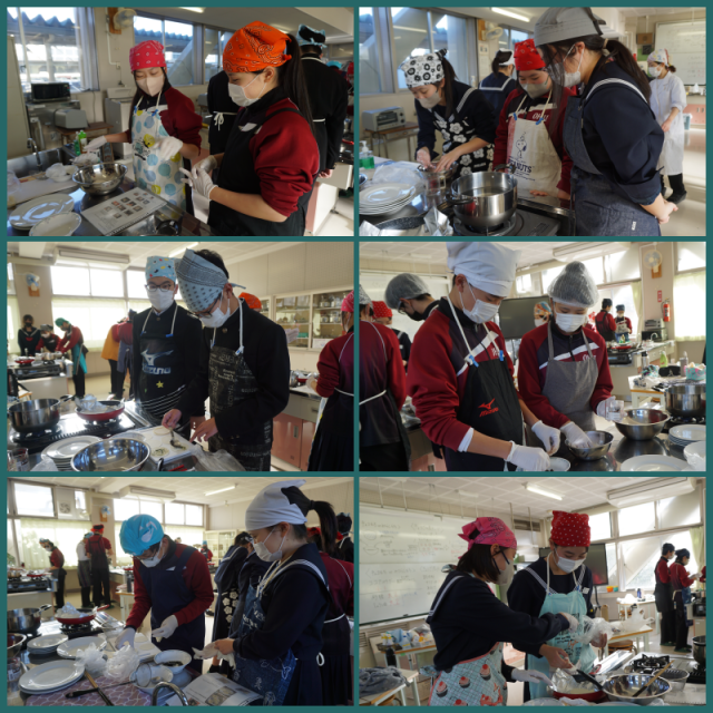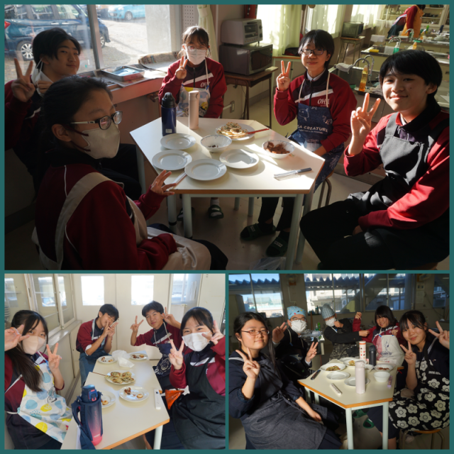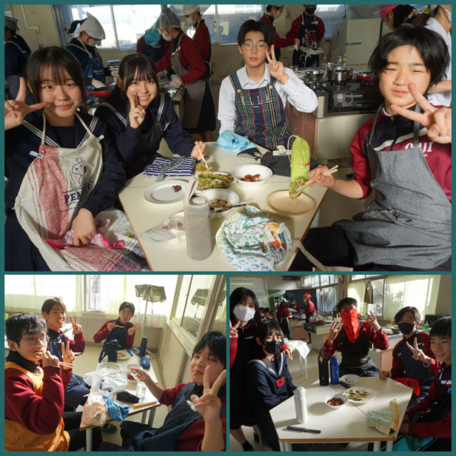 レシピを確認しながら調理スタートです。担任の先生も仲良く一緒に実食です。どのクラスも仲の良さ、チームワークを見せつけられた調理実習となりました。