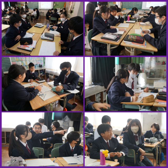 球の体積の求め方について学習を行っていました。難しいため、頭を抱えている生徒が多くいましたが、分からないことに寄り添い、共有して学びを深めていました。
