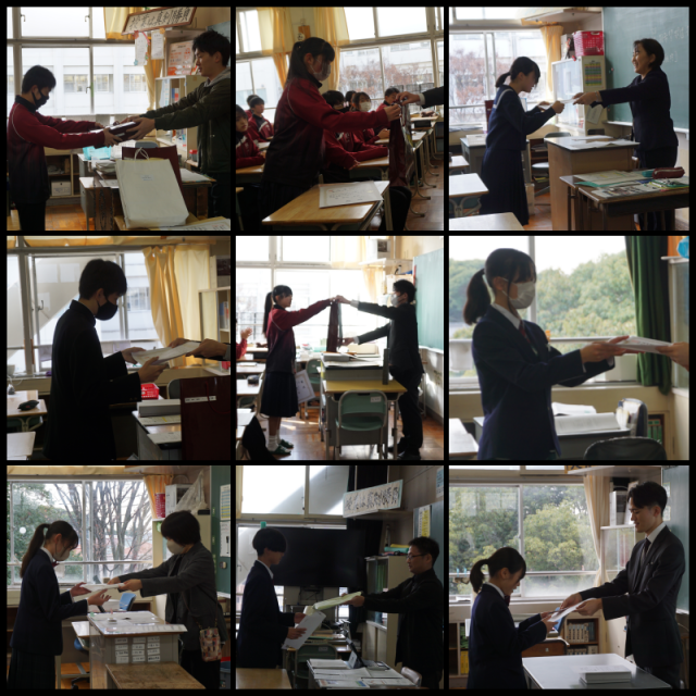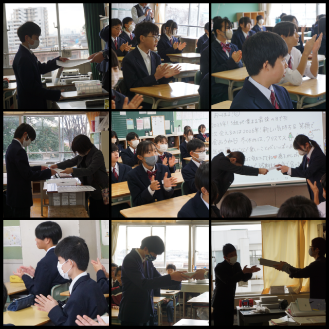 2学期終業式 公開日 2025/12/23 更新日 2025/12/23 学年ギャラリー 放送にて始業式を行いました。学年代表生徒や校長先生、生徒指導の先生から話がありました。また、さまざまな大会等の表彰を行いました。 +1 いいね(0)