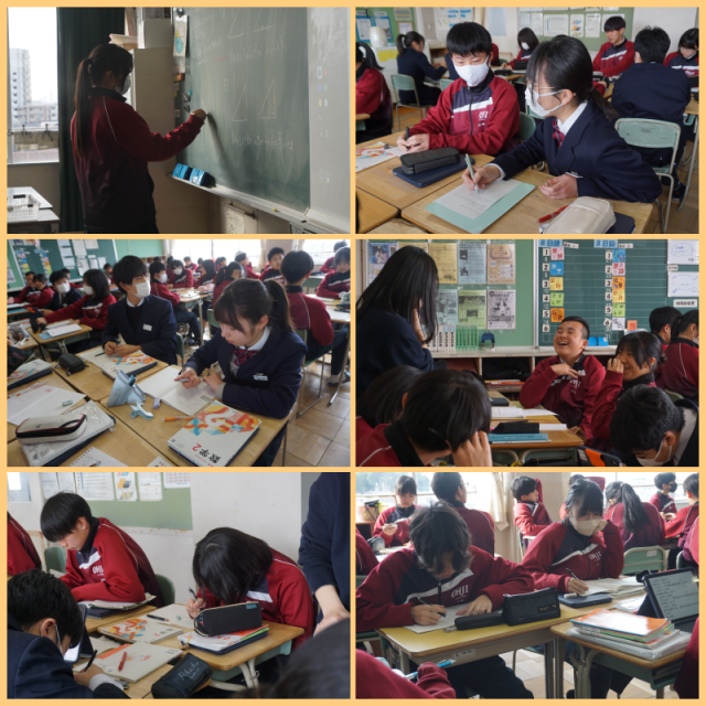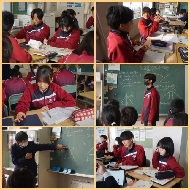 数学 2年生 公開日 2026/01/16 更新日 2026/01/16 学年ギャラリー 二等辺三角形の合同について学習を行っていました。今までの知識を活かして、課題に取り組んでいました。 いいね(0)