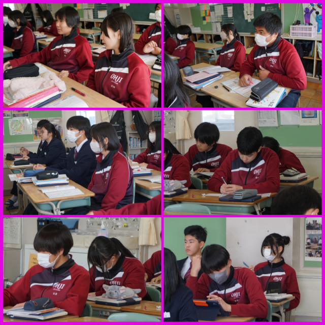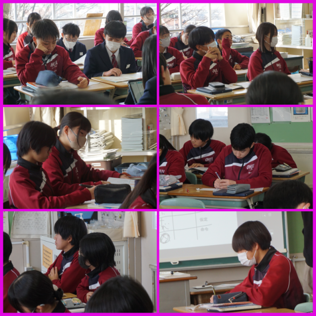 文法の学習を行っています。形容詞と形容動詞の活用について教わり、問題を解いていました。テスト前にしっかりと復習ができるといいですね。