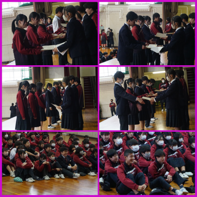 学年レクリエーションの表彰式と、所属の先生の話を聴きました。心に響く話がたくさんありましたね。先生たちの思いを大切にして、残りの中学校生活を過ごしたいですね。