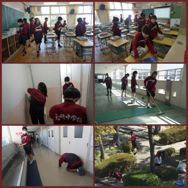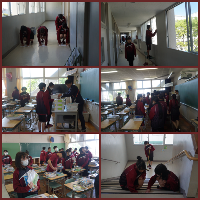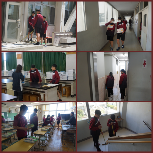 体育館での会場作りや校舎の清掃、教室準備等を行いました。ハレの日を気もち良く迎えていただけるように、担当個所を丁寧に取り組んでいました。