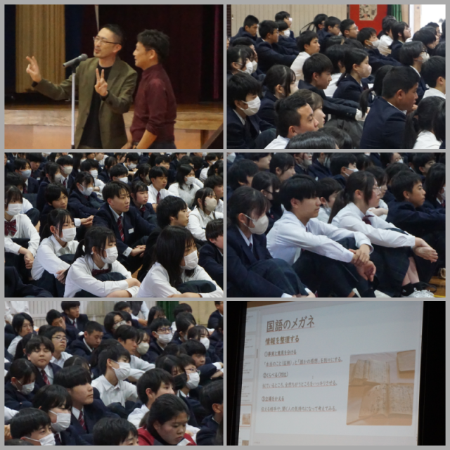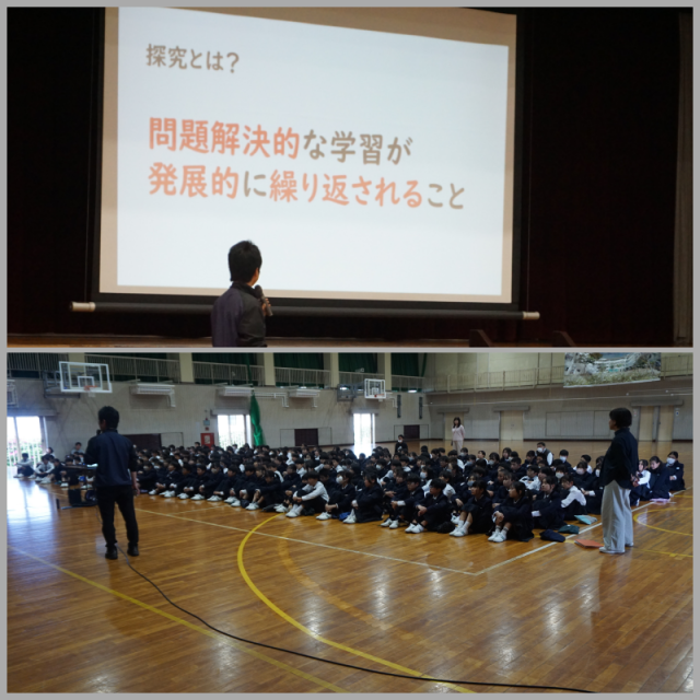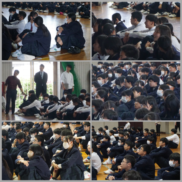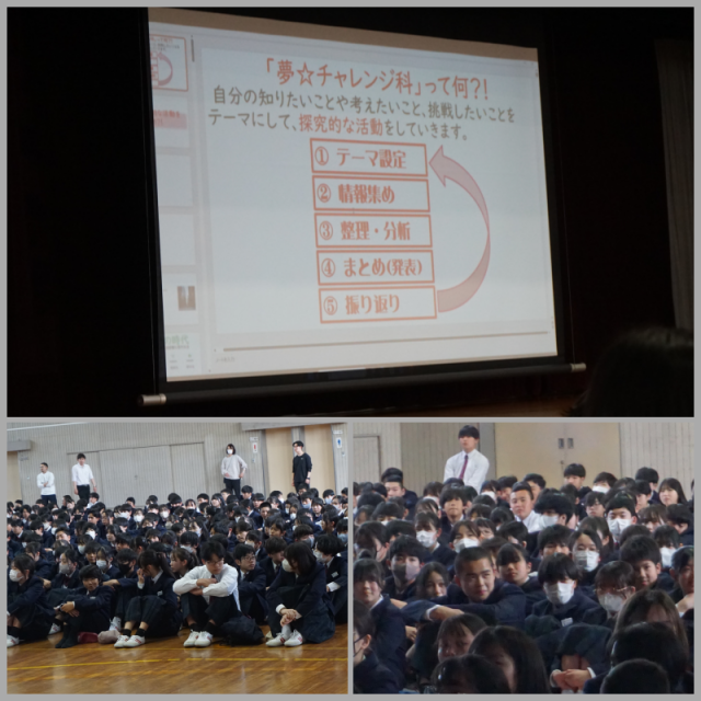 体育館で、オリエンテーションを行いました。「探究活動」についての説明や、テーマ決め、年間計画などの話がありました。