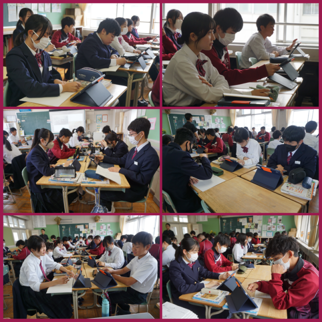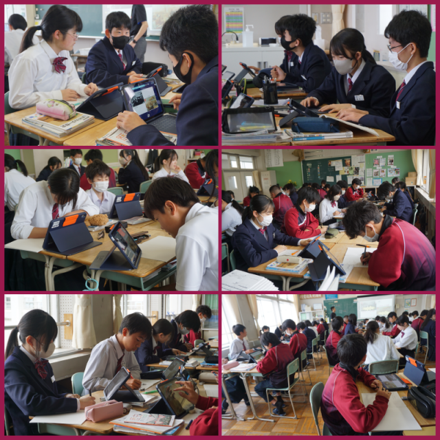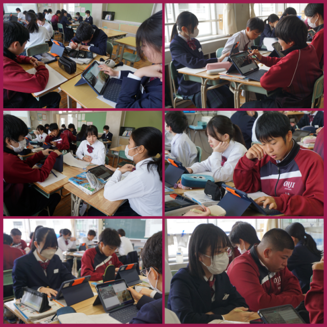 歴史の学習を行っています。写真を見て、どこの国でどんなことが起きていたのかをグループで話し合い、クラスで共有していました。