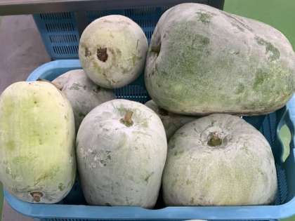 今日の給食で使用した冬瓜は小牧市産の早生冬瓜で、表面に白い粉をふいていました。完熟した証拠です。