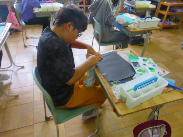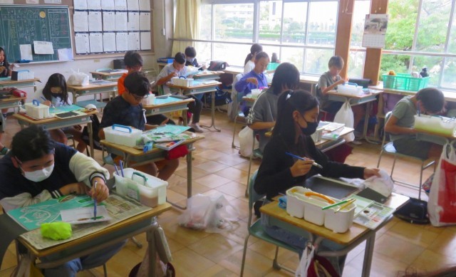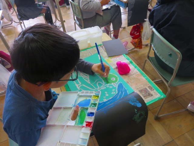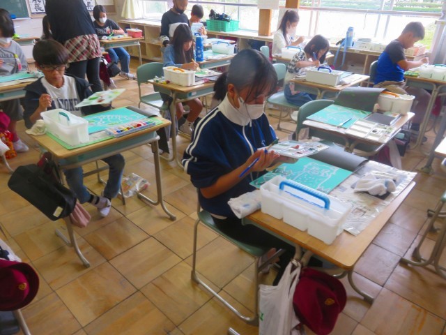 5年生は1~4時間目に図工競技会を行いました。多色刷り木版画に挑戦し、本時までに彫り進め、今日は彩色を行いました。台紙にはっきりと色がつくように、たっぷり出した絵の具に白を少し混ぜながら、何度も刷り重ね、作品を完成をさせました。