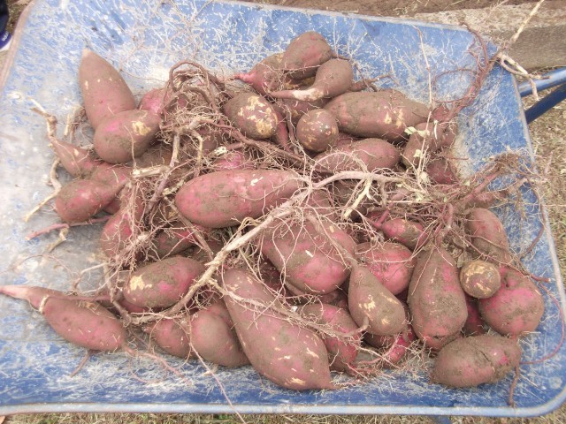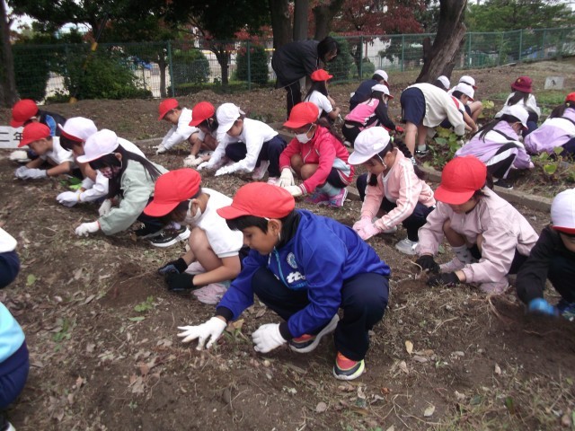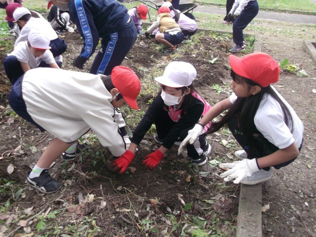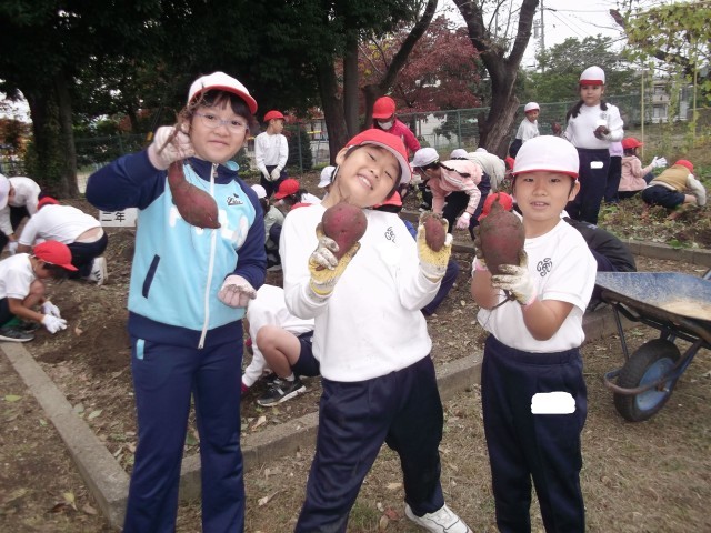 6月にさつまいもの苗を植え、これまでにこまめに水をあげたり、雑草を抜いたりして育ててきました。今日は、いよいよ収穫です。体操服に着替え、軍手をはめ、つるをたどって土の中を丁寧に掘り進めていくと・・・。大きなさつまいもがごろごろと出てきました。さつまいもを見つけるたびに大きな歓声が上がり、たくさん収穫することができました。今度は収穫したさつまいもを使った鬼まんじゅう作りを行います。