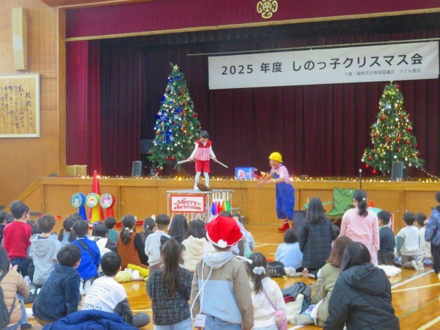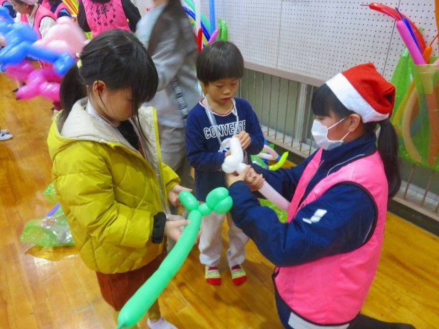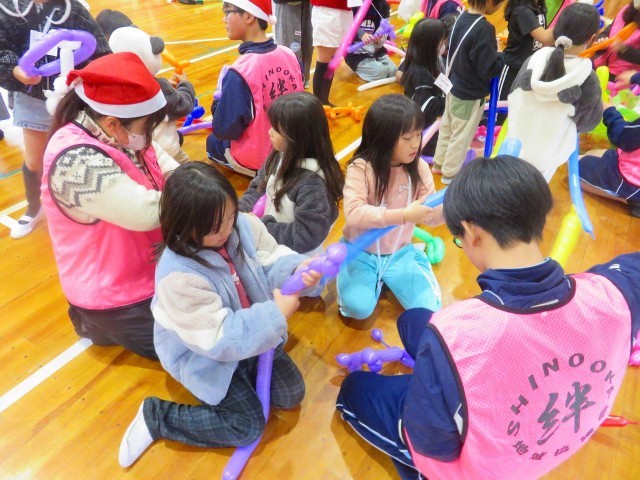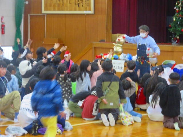 12月20日(土)に地域協議会主催のもちつき大会・クリスマス会が篠岡小学校を会場にして開催されました。午前中は、臼と杵で力強く餅をつき、参加した地域の方や子どもたちに振る舞われました。午後からは、児童を対象にしたクリスマス会が体育館で行われ、第1部は圧倒的なパフォーマンスの大道芸を間近で見ることができました。第2部ではバルーンアートの先生を講師としてお呼びし、バルーンアートの実演と作品作りが行われました。最後には、お楽しみ抽選会もあり、子どもたちにとっては素敵な時間が過ぎました。楽しい思い出ができましたね。