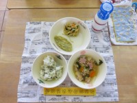 今日は新年を感じる献立です。ごはん、牛乳、雑煮、ぶりの竜田揚げ、だいこんとにんじんの煮あえ です。たくさん食べて元気の過ごしたいですね。