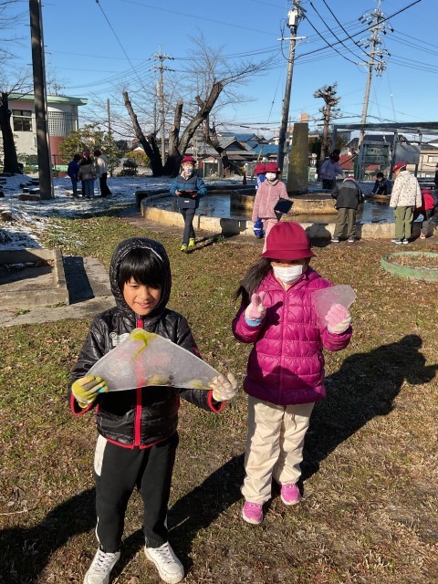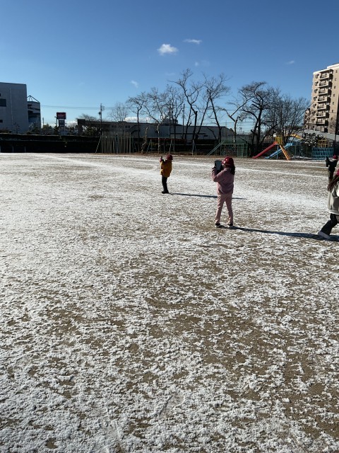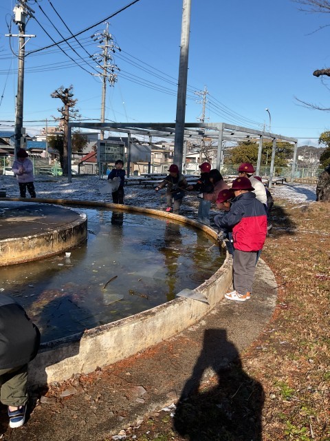 まだ校庭に残っている雪や冬ならではの様子を探しに出かけました。雪に顔を近づけて観察してみたり池に張った氷を触ってみたり、なかなかない光景に嬉しそうにしていました。それにしても、本当に子どもは寒さに強いですね。