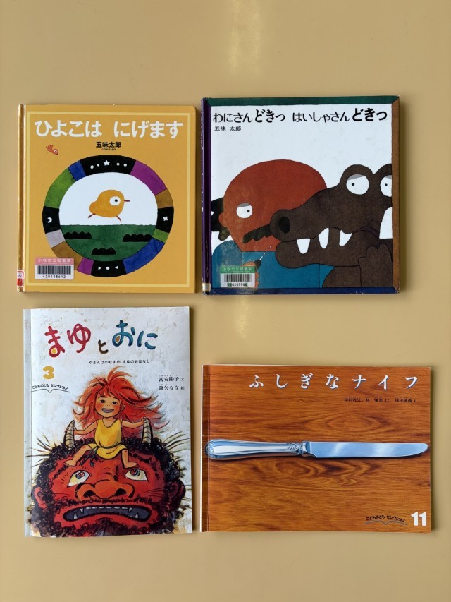 今回読んだ絵本は、「ひよこはにげます」「わにさんどきっ はいしゃさんどきっ」「まゆとおに」「ふしぎなナイフ」の4冊です。