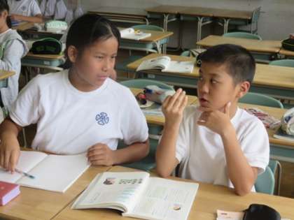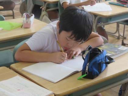 「日常を十七音で」という単元で俳句作りに挑戦です。指を折って音の数を数えながら頭をひねります。「きれい」「大きい」「うれしい」など、様子を形容詞などを使って書いてしまいがちですが、それらの言葉を使わなくても様子や思いが伝わるように工夫しています。