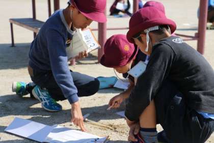 3年生の理科、「太陽の光を調べよう」の単元です。ここでは、太陽の光を虫眼鏡で集めたり、鏡で反射させたりして調べています。よく晴れた今日は地面の温度を測りました。直接日光が温度計に当たらないように、覆いをして計ります。太陽の光が地面を温めることを調べます。