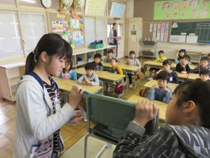 6年生の読んでくれる紙芝居に、1年生が静かに耳を傾けます。