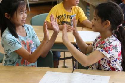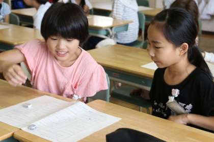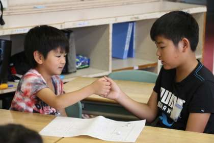こちらは2年生と5年生のペアです。今日のフレンドデーでは、2人で「なかよしすごろく」をしました。これは児童会の役員の子が考えたアイディアです。2人に1枚、すごろくが配られます。コマが止まったところに、質問がかいてあったり、ハイタッチや握手などの指示が書いてあり、それに従います。遊びながら互いの距離を縮めます。